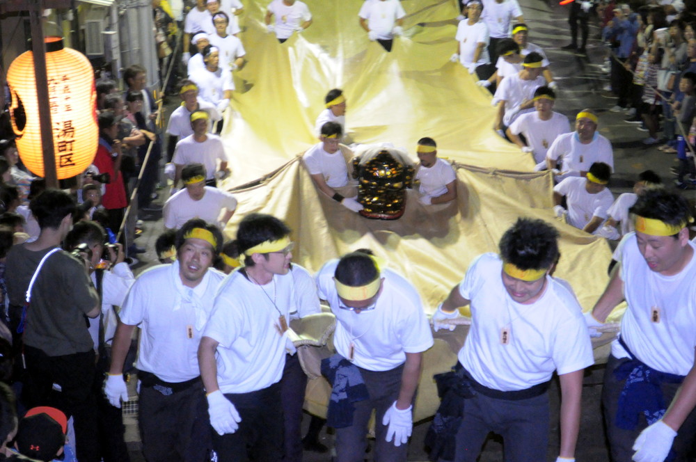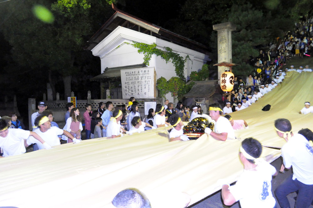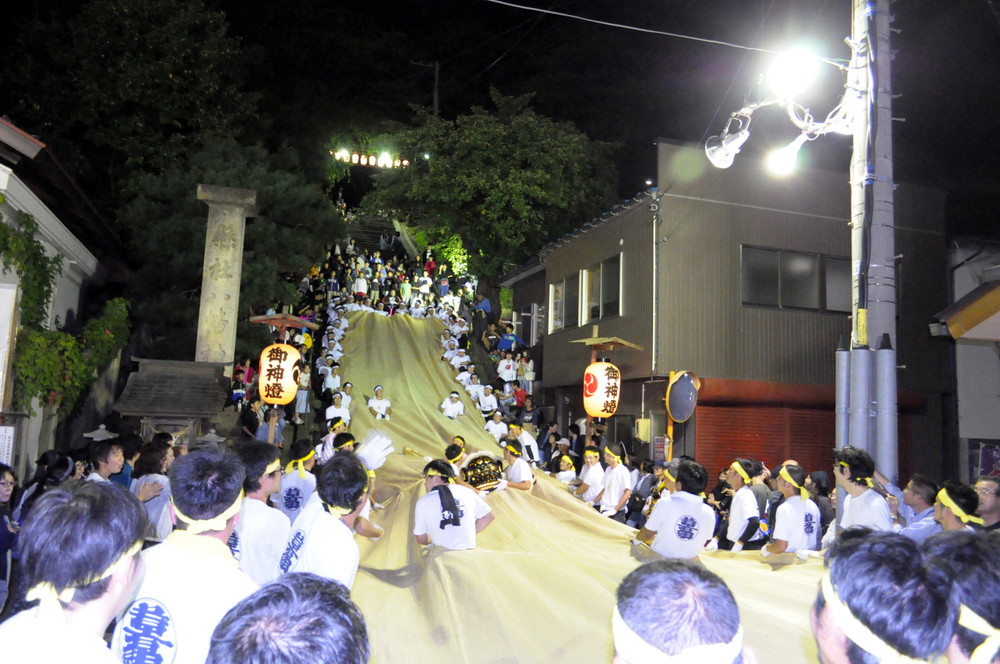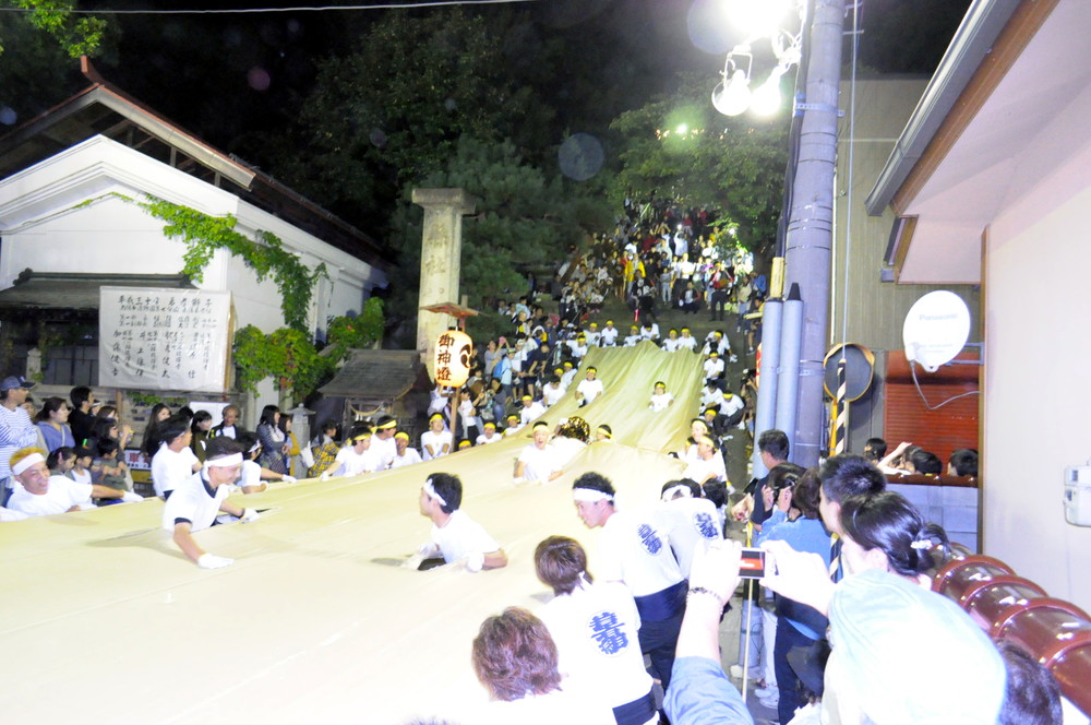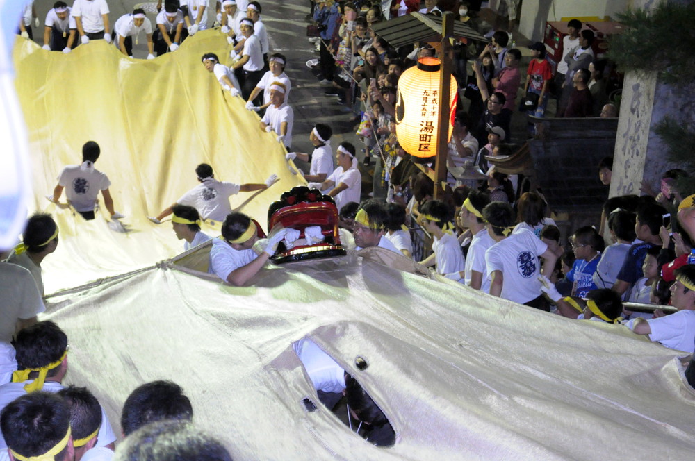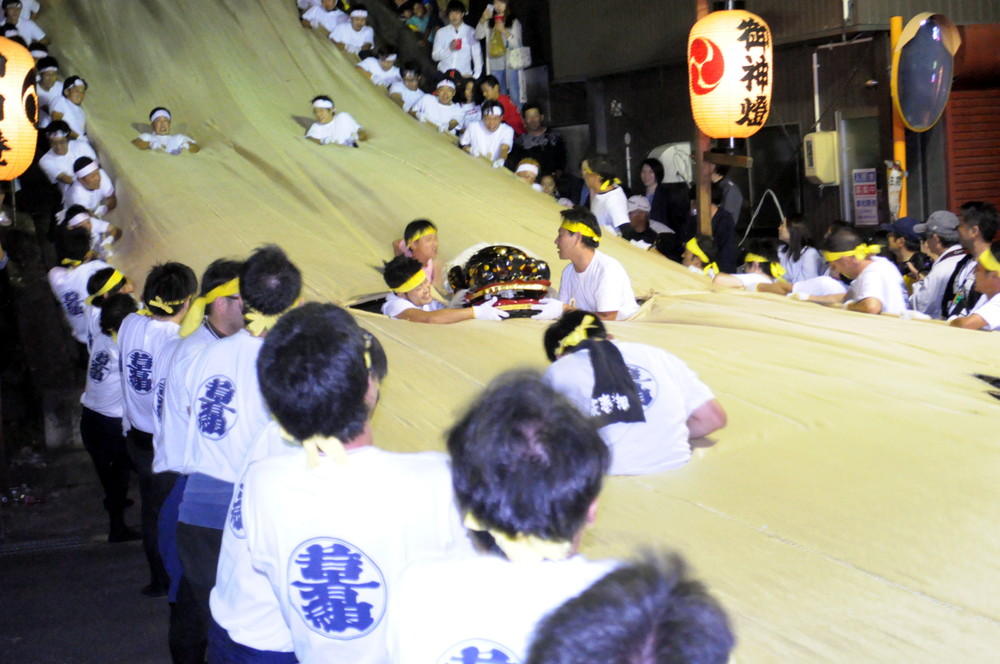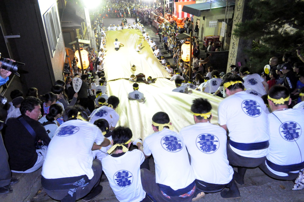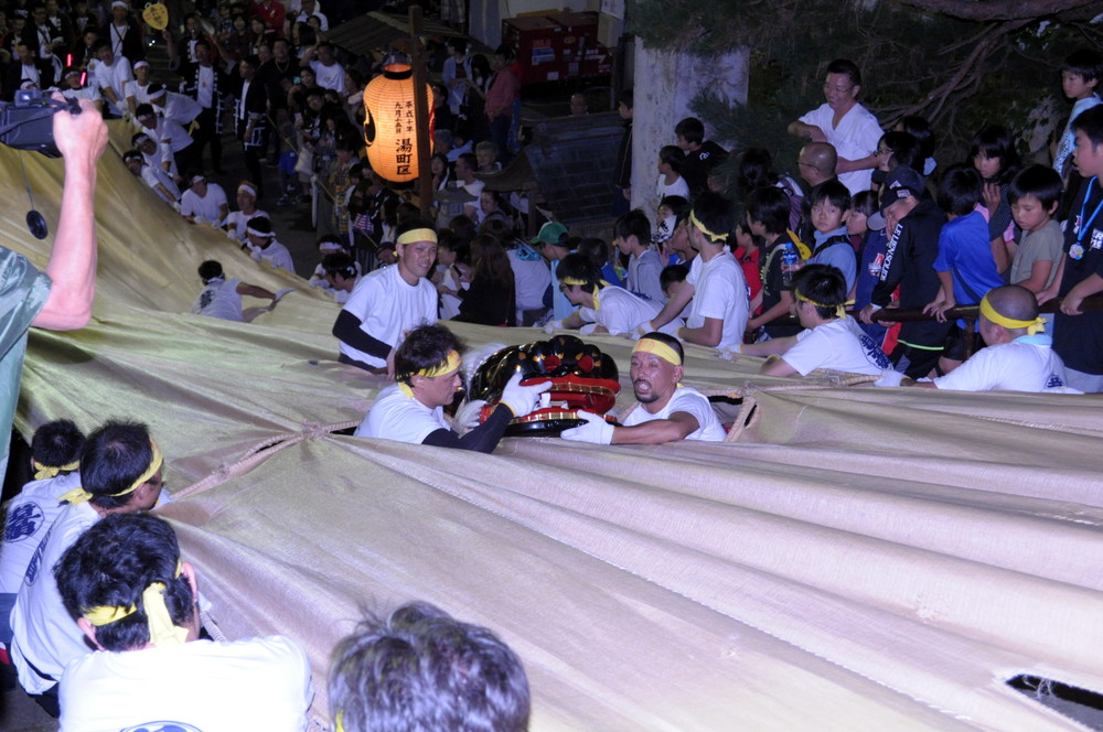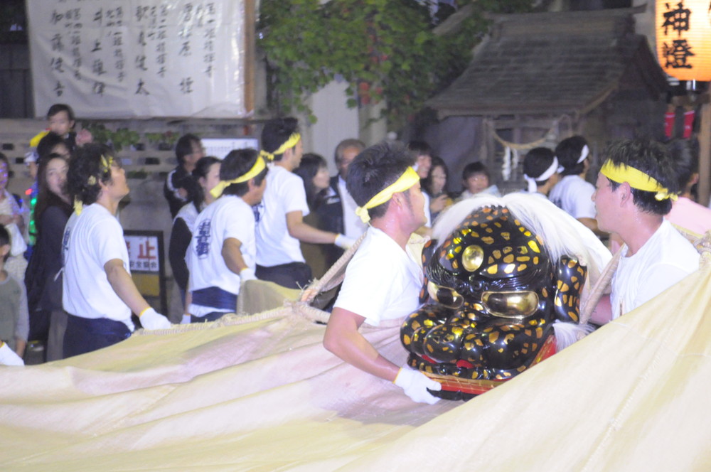 お幕の中央付近に獅子頭があり、互いに前と後ろで引き合い、引き勝った方向へ進むので「暴れ獅子」とも呼ばれています。