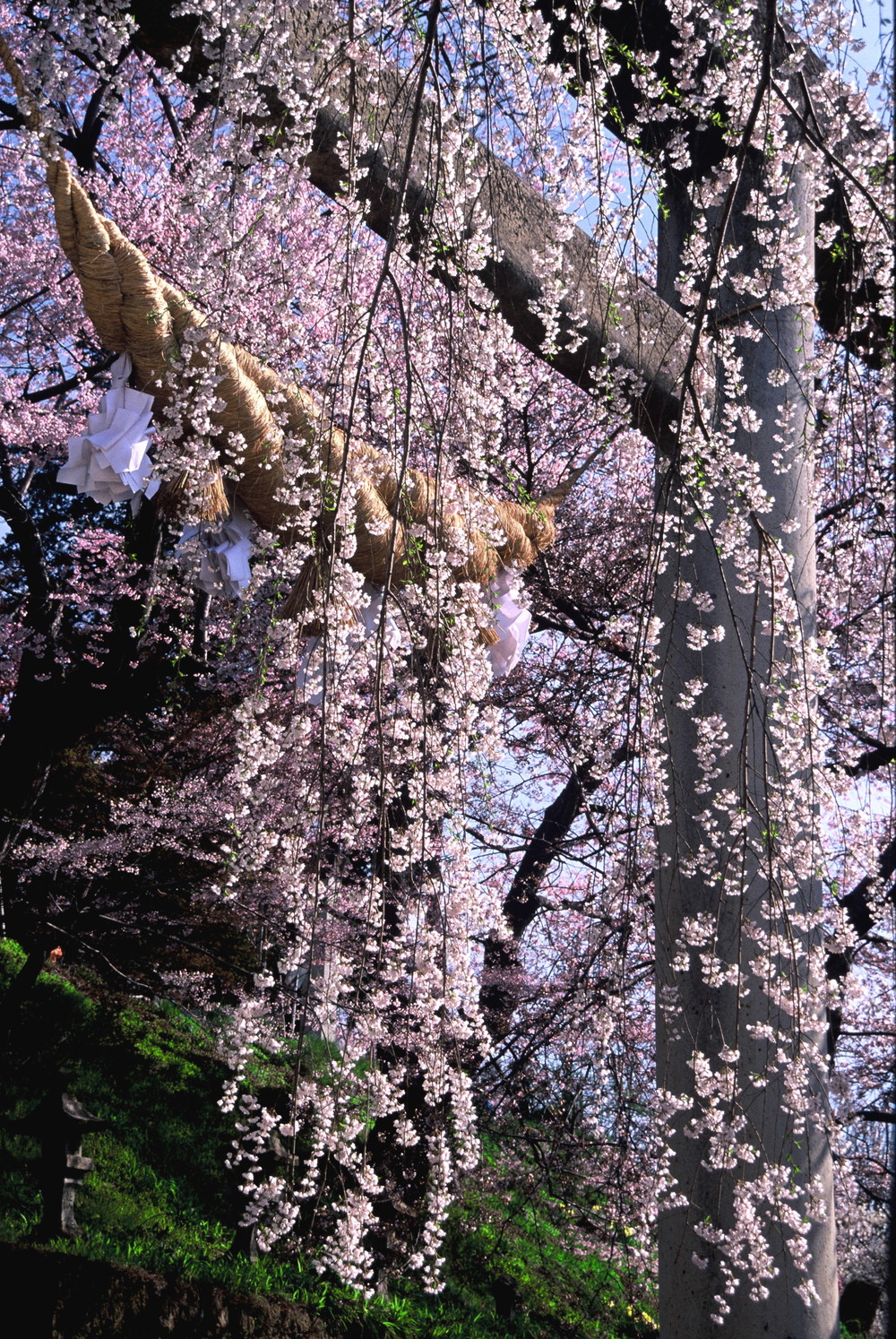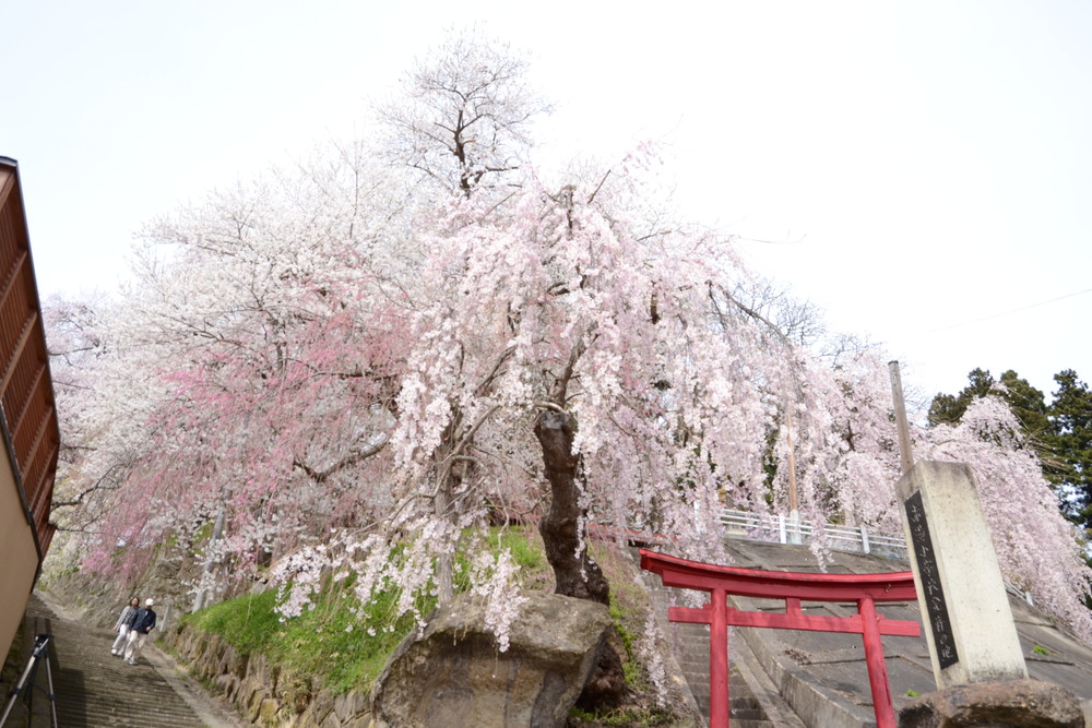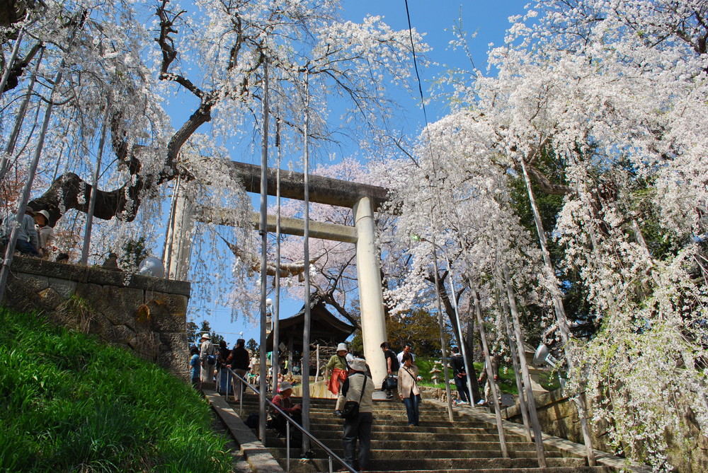 大鳥居に映えるシダレザクラ、「二代目放鳥目白桜」「全国桜名木二代目園」「桜句碑」「輪廻の桜」などが見所。